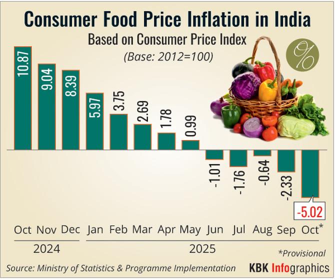 According to the data released by the National Statistics Office (NSO), the food inflation declined to (-) 5.02 per cent in October.