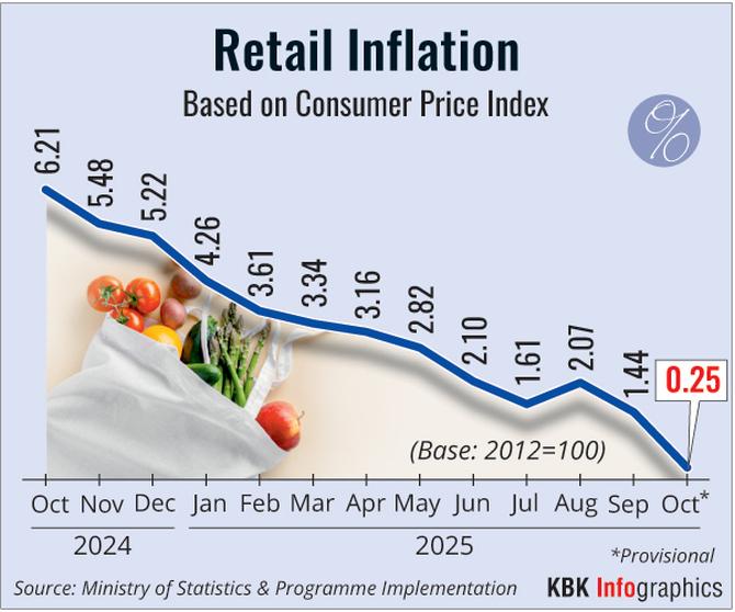 Retail inflation slipped to a multi-year low of 0.25 per cent in October, driven by the impact of the GST rate cut and subdued prices of vegetables and fruits, government data showed on Wednesday.