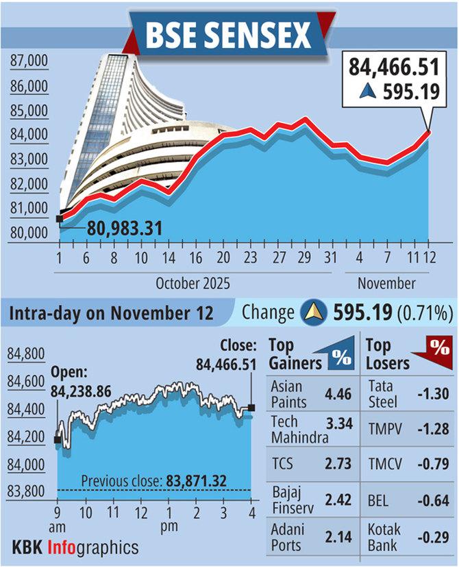 The 30-share BSE Sensex rallied 595.19 points, or 0.71 per cent, to settle at 84,466.51.