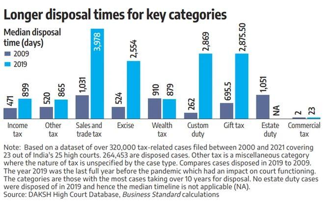 From 2009 to 2019 — the last year before the pandemic-induced disruption — the median time for disposal was up over 90 per cent for income tax cases, and a massive 200-400 per cent for sales and trade tax, and excise duty cases.
